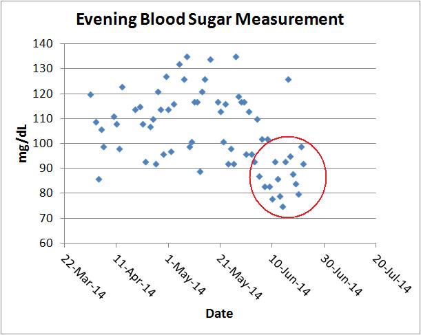 Even my evening blood sugar measurements (that are taken 2 hours after dinner) also showed a dramatic shift down during the past 2 weeks.