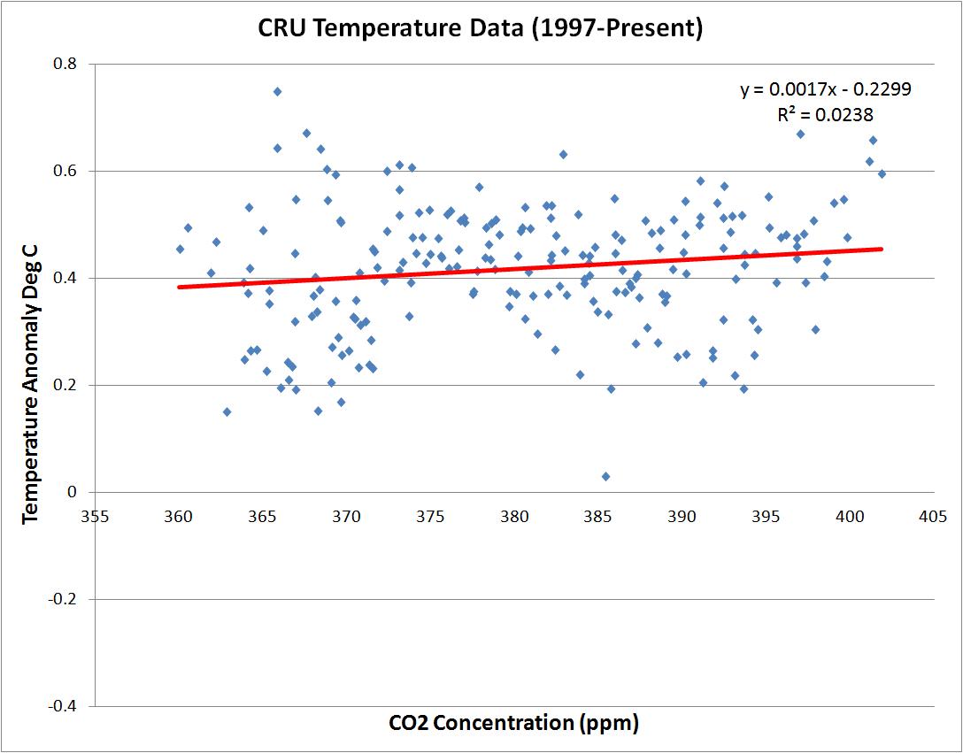 Using the graphs above, we see that for the past 17+ years the actual temperature rise per CO2 ppm was 0.0017°C (for CRU), -0.0006°C (for RSS) and 0.0035°C (for UAH). So at best (using the UAH data) the AGW cult predictions were off by a factor of 2 but using the CRU data the predictions were off by a factor of 4. And the RSS data shows a negative correlation to CO2 (more CO2 causes temperatures to decrease) so the AGW cult predictions were totally wrong because the temperature anomalies DECREASED when atmospheric CO2 was increasing.