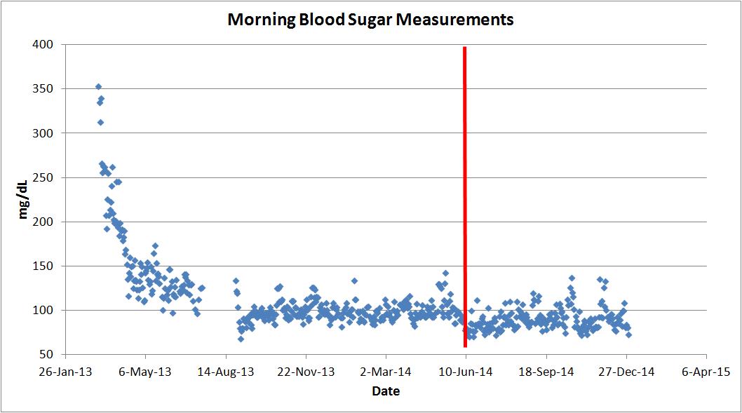 First, the unexplainable step function shift in my morning blood sugar measurements that happened in June 2014 appears to be sustainable as you can see from this graph below (the red line signifies the point where my blood sugar measurements shifted).
