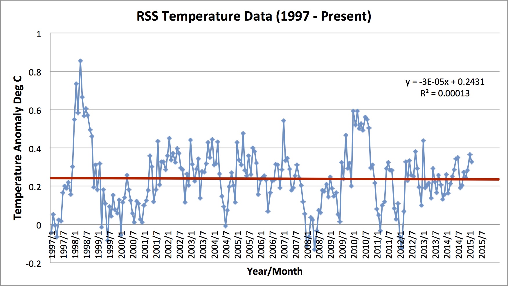 Never mind that satellite temperature measurements of our atmosphere have been flat since 1997: