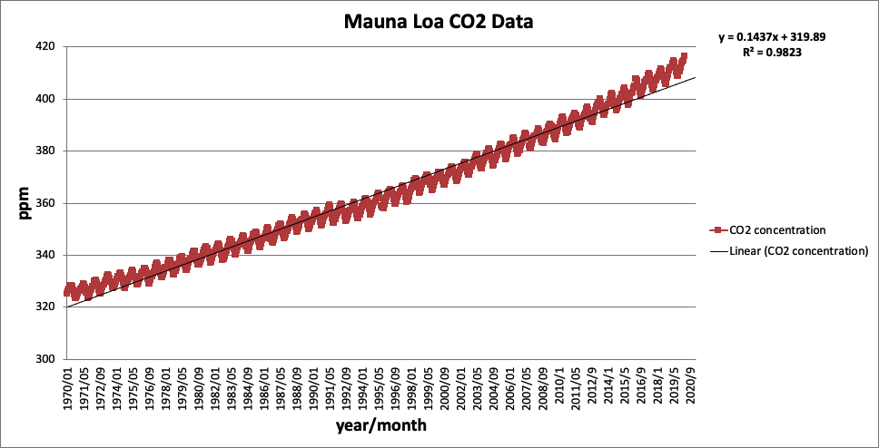 Unlike the simulated CO2 emissions data, atmospheric CO2 levels are measured quite accurately monthly and I have plotted the data from 1970 through April 2020 below.