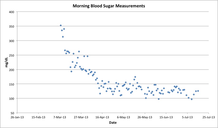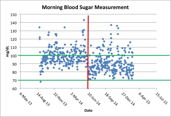 For two years I’ve been measuring my blood sugar at least once a day (“fasting” – in the morning when I wake up) and most days I add another measurement after a meal (usually 2 hours after dinner). I keep meticulous records of these measurements and as I’ve made changes in my lifestyle to keep my blood sugar levels in the normal range, I’ve used these daily measurements as my guide.